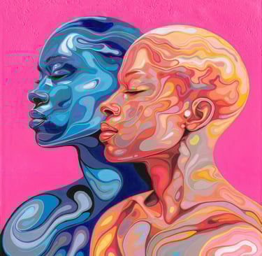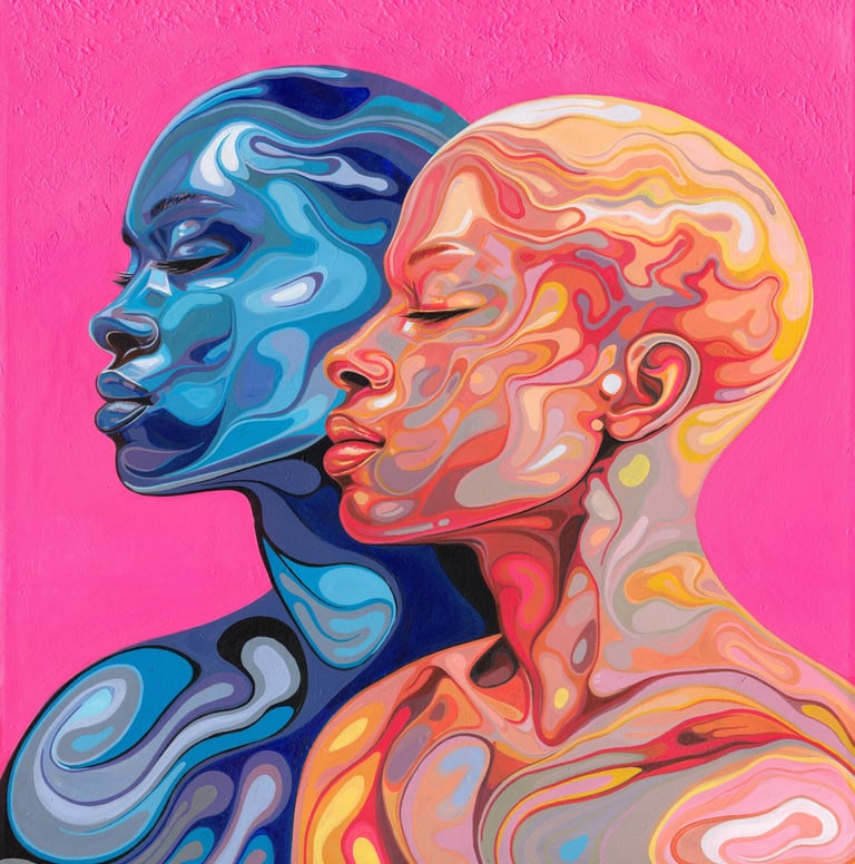 Two intertwined figures face the same direction yet seem to inhabit different emotional temperatures: one bathed in serene blues, the other illuminated in vibrant warmth. Their coexistence reflects the duality within the artist, the past self molded by societal expectations, and the evolving consciousness seeking freedom through self-awareness.
